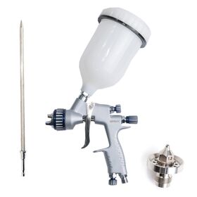 Допдюза 1.3мм+игла 1.3мм, бачок 600мл., адаптер-соединитель с резьбы F1/4" на быстросъём M1/4", пластиковый мини-фильтр для ЛКМ, универсальный ключ для обслуживания краскопульта, щётка для чистки, ёршик для чистки.