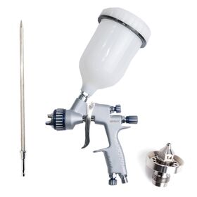 Допдюза 1.4мм+игла 1.4мм, бачок 600мл., адаптер-соединитель с резьбы F1/4" на быстросъём M1/4", пластиковый мини-фильтр для ЛКМ, универсальный ключ для обслуживания краскопульта, щётка для чистки, ёршик для чистки.