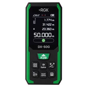 Лазерный дальномер RGK DX-50G – профессиональный комбинированный измерительный инструмент строительного назначения с рабочим диапазоном до 50 м, снабженный интегрированным инклинометром, встроенной памятью и цветным графическим дисплеем. Прибор проецирует зеленый маркер, по которому визуально контролируется местоположение точки наведения в ходе замеров. Он лучше различим на ярком солнце, благодаря чему инструмент является оптимальным выбором для работы на открытых площадках.