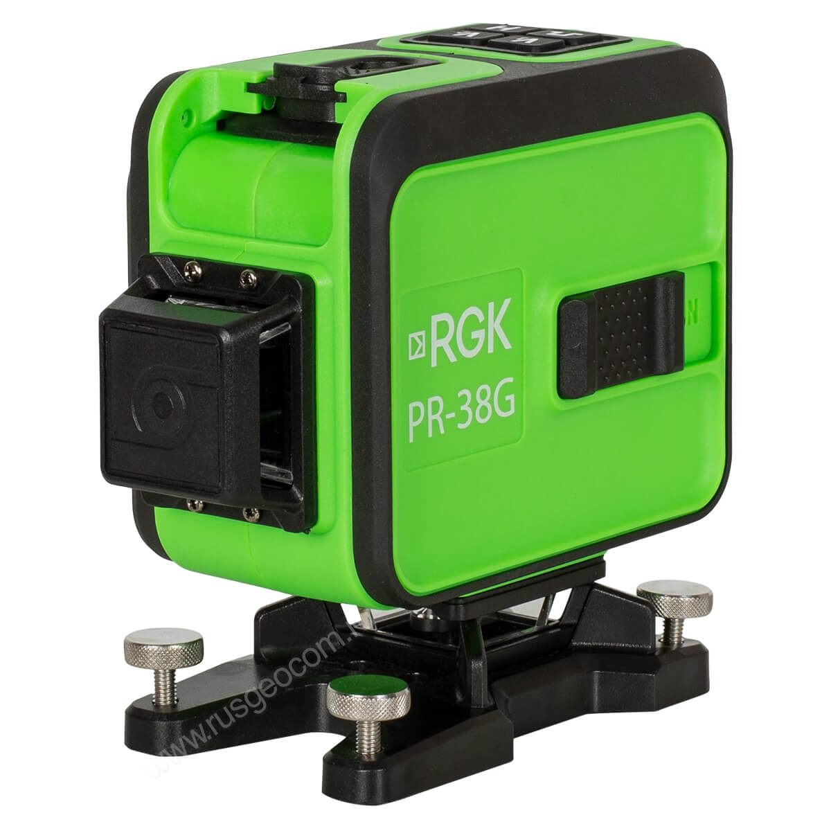 Корпус лазерного построителя плоскостей RGK PR-38G отлит из прочного шагреневого АБС-пластика, к которому не липнет пыль. Управляющие элементы и кромки, на которые обычно приходятся удары при падении, прорезинены. Рельефные кнопки и рычаг включения задействуются четко, ими удобно пользоваться в рабочих перчатках. Нивелир не боится попадания водяных брызг.