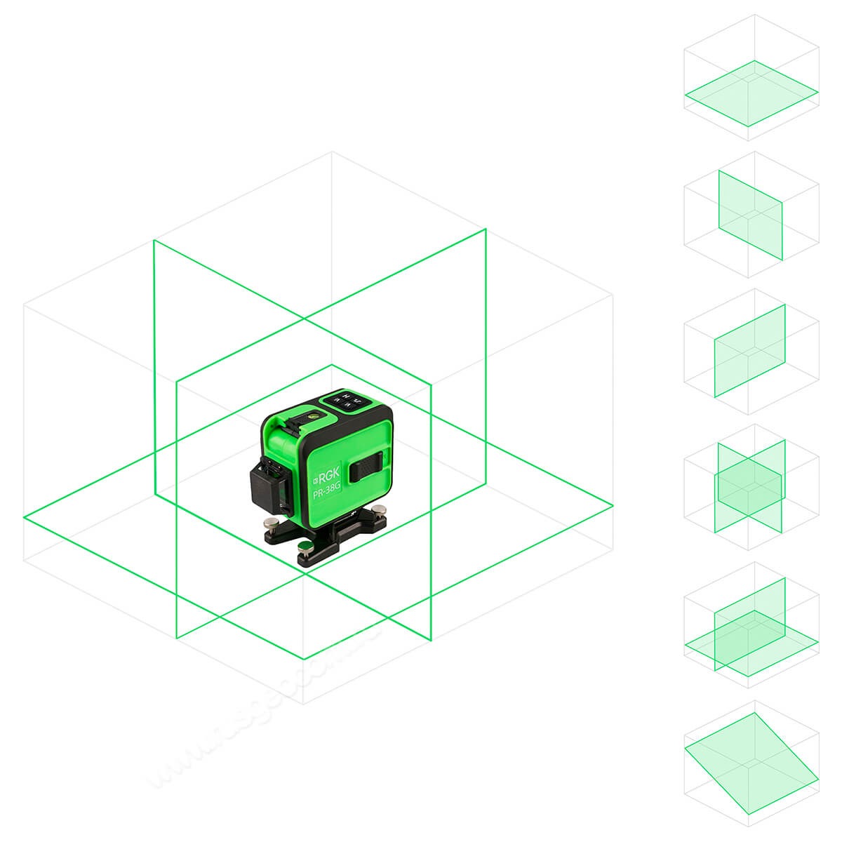 Лазерный нивелир RGK PR-38G - это уровень с 3 замкнутыми плоскостями для выполнения строительных, отделочных и дизайнерских работ в помещениях и за их пределами. Прибор проецирует 1 горизонтальный луч на высоте 2.3 см от пола и 2 взаимно перпендикулярных вертикальных. Зеленые лучи обладают лучшей видимостью в сравнении с красными, особенно в условиях хорошей освещенности. При точности ±0,2 мм/м рабочая дальность составляет 20 м, она может быть увеличена до 50 м при использовании приемника.