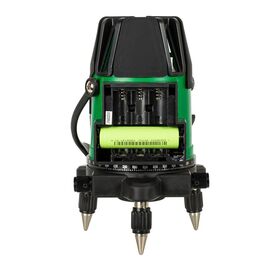 Нивелир проецирует пять линий: четыре вертикальных с развёрткой 120° и горизонтальную с углом в 110°. Вертикальные линии проецируются на 120° и заходят на потолок, формируя перекрестие над прибором. В сочетании с лазерным отвесом это позволяет использовать устройство для переноса точек по вертикали. Например, при разметке светильников. Управление осуществляется тремя кнопками: включения, переключения вертикальной и горизонтальной линий.