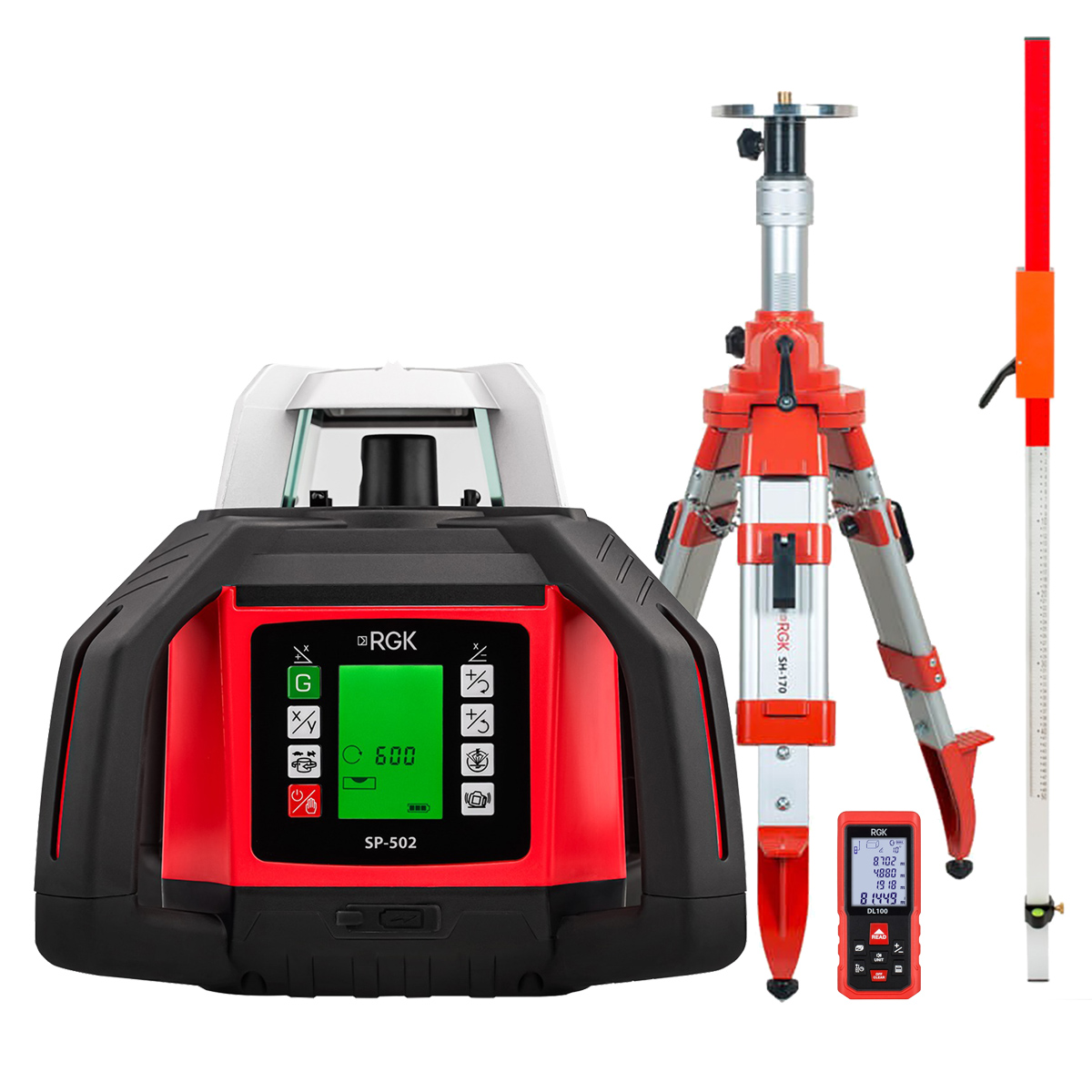 Комплект: ротационный нивелир RGK SP-502 с калибровкой + элевационный штатив RGK SH-170 + рейка RGK LR-2 + дальномер RGK DL100