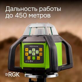 Пульт дублирует большинство функций клавиатуры и работает на расстоянии до 20 м от прибора. Дистанционное управление особенно удобно на многоуровневых объектах с лесами, лестницами и другими препятствиями между специалистом и RGK SP-610G.