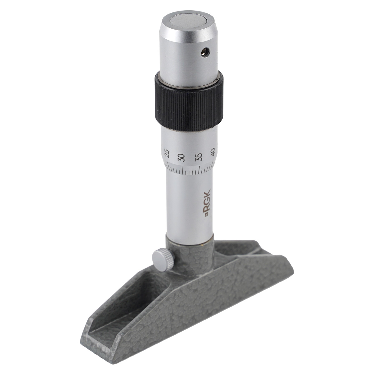 Глубиномер микрометрический RGK GM-50 представляет собой механический измерительный прибор, который может использоваться в ходе высокоточных работ по обработке металлов и прочих материалов, обеспечивая контроль геометрических параметров изделий с погрешностью, не превышающей ±4 мкм. Инструмент оборудован стандартной микрометрической головкой с максимальным вылетом до 25 мм. В отличие от младшей модели GM-25, для измерений в пределах от 25 до 50 мм поставляется дополнительный стержень с увеличенной длиной вылета. При необходимости, возможно дальнейшее повышение пределов измерения инструмента путем его дооснащения сменными измерительными элементами нужного типоразмера.