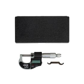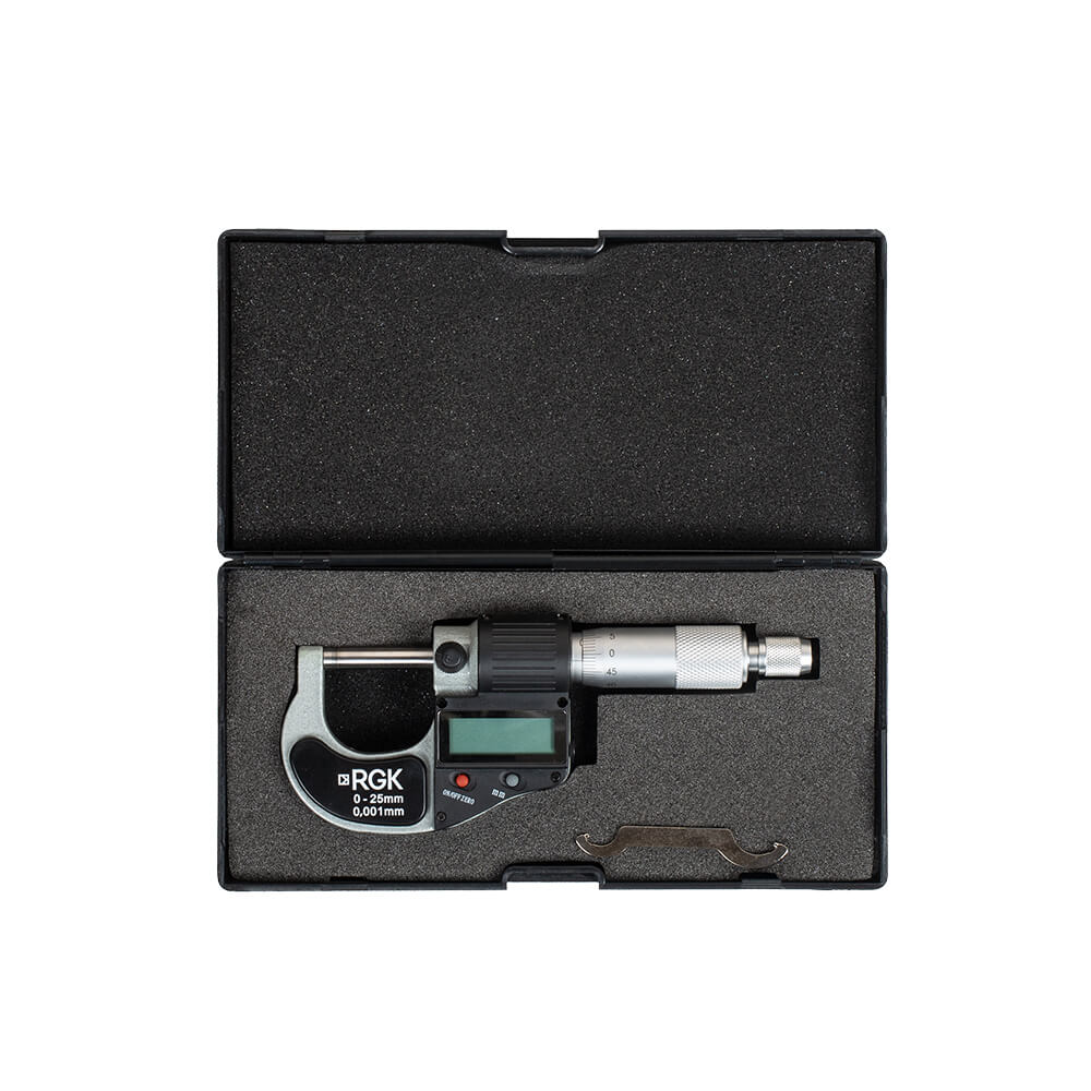 В набор входит регулировочный ключ для настройки и выставления нуля. Для хранения и безопасной транспортировки комплекта предусмотрен прочный защитный футляр с ложементом, надежно удерживающим микрометр RGK MC-25.