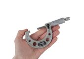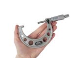Для минимизации погрешности, вызванной температурным расширением металла, скоба в месте удержания снабжена пластиковыми накладками, а комплектная концевая мера 25 мм – наружной оболочкой с теплоизоляционными функциями. Твердосплавные напайки на торцевые измерительные поверхности пятки и микрометрического винта минимизируют их износ при активной эксплуатации инструмента. Полуповоротный зажимной рычаг позволяет фиксировать положение измерительных плоскостей для недопущения их случайного смещения при снятии показаний.