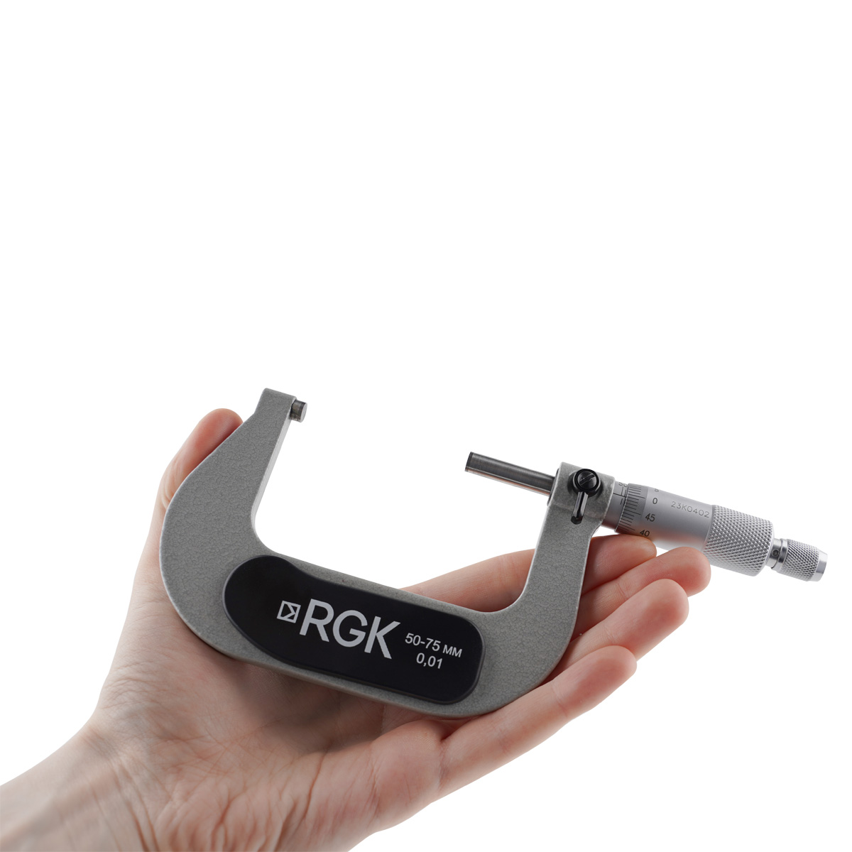 С целью максимального увеличения срока эксплуатации измерительные плоскости микрометрического винта и пятки защищены от истирания твердосплавными напайками. Вылет рабочей части микрометрического винта может фиксироваться с помощью полуповоротного зажима, исключая случайное смещение измерительных плоскостей при считывании показаний с механического микрометра RGK MCM-75.