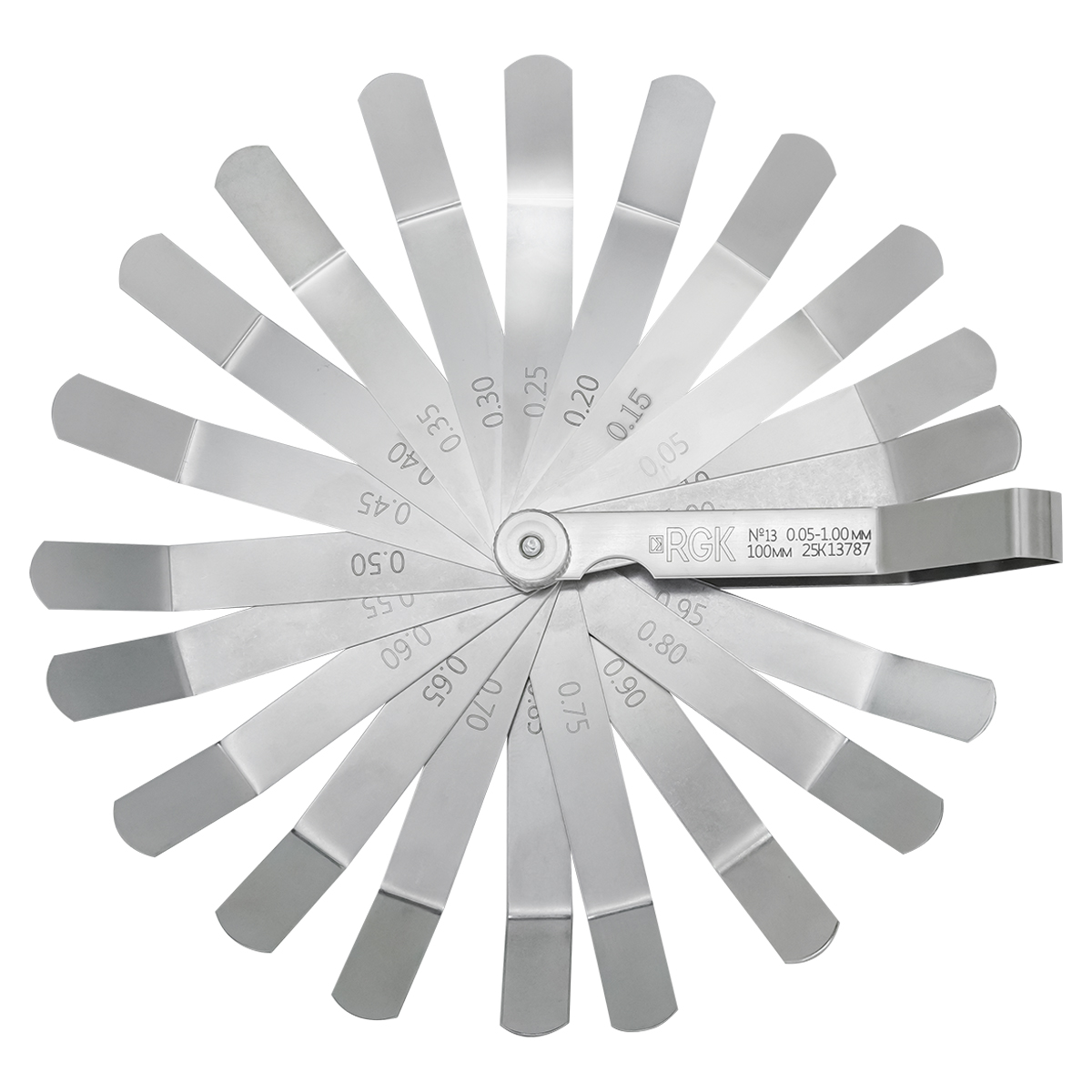 Набор щупов №13 (0,05-1,00) относится к механическим измерительным инструментам, которые предназначены для определения линейных размеров и могут использоваться в качестве рабочих калибров для контроля зазоров в машиностроении и других отраслях с целью обеспечения проектных посадок деталей и узлов в процессе сборки/монтажа и при выполнении регулировок. Ручной инструмент включает в себя помещенные в рамочную обойму на общей оси, обеспечивающей шарнирное соединение, 20 стальных измерительных пластин нормированного размера, толщина которых возрастает от 0,05 до 1,00 мм с шагом 0,05 мм. Данный комплект оптимизирован для выполнения замеров в труднодоступных местах, что обеспечивается благодаря изогнутой форме щупов.