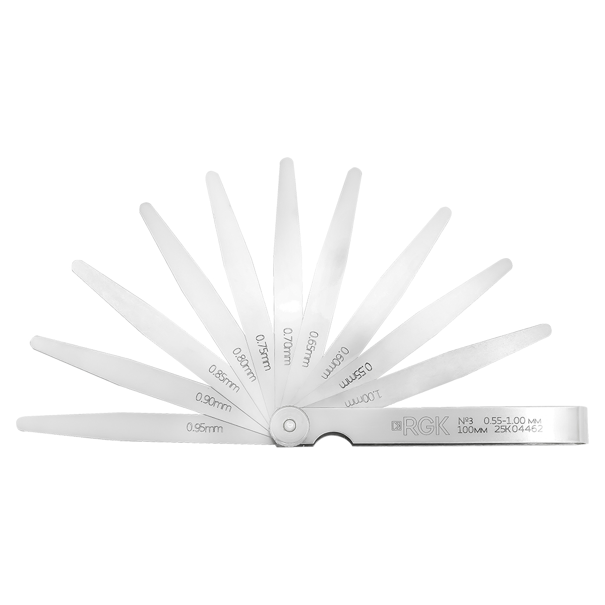 Набор щупов №3 (0,55-1,00) может использоваться для контроля соответствия фактических размеров просветов и зазоров требованиям нормативной документации в ходе слесарной и механической обработки сложных изделий, при сборке и регулировке механизмов и машин, в процессе монтажа конструкций, обеспечивая нормированное сопряжение их элементов, и т.п. Ручной инструмент позволяет выполнять измерения по принципу калибра в диапазоне от 0,55 до 1,00 мм с шагом 0,05 мм, используя в качестве измерительных элементов 10 стальных пластин плоской формы нормированной толщины, которые помещаются в общей обойме. Сужающаяся форма щупов, скругленных на конце, дает возможность выполнять замеры в узких местах.
