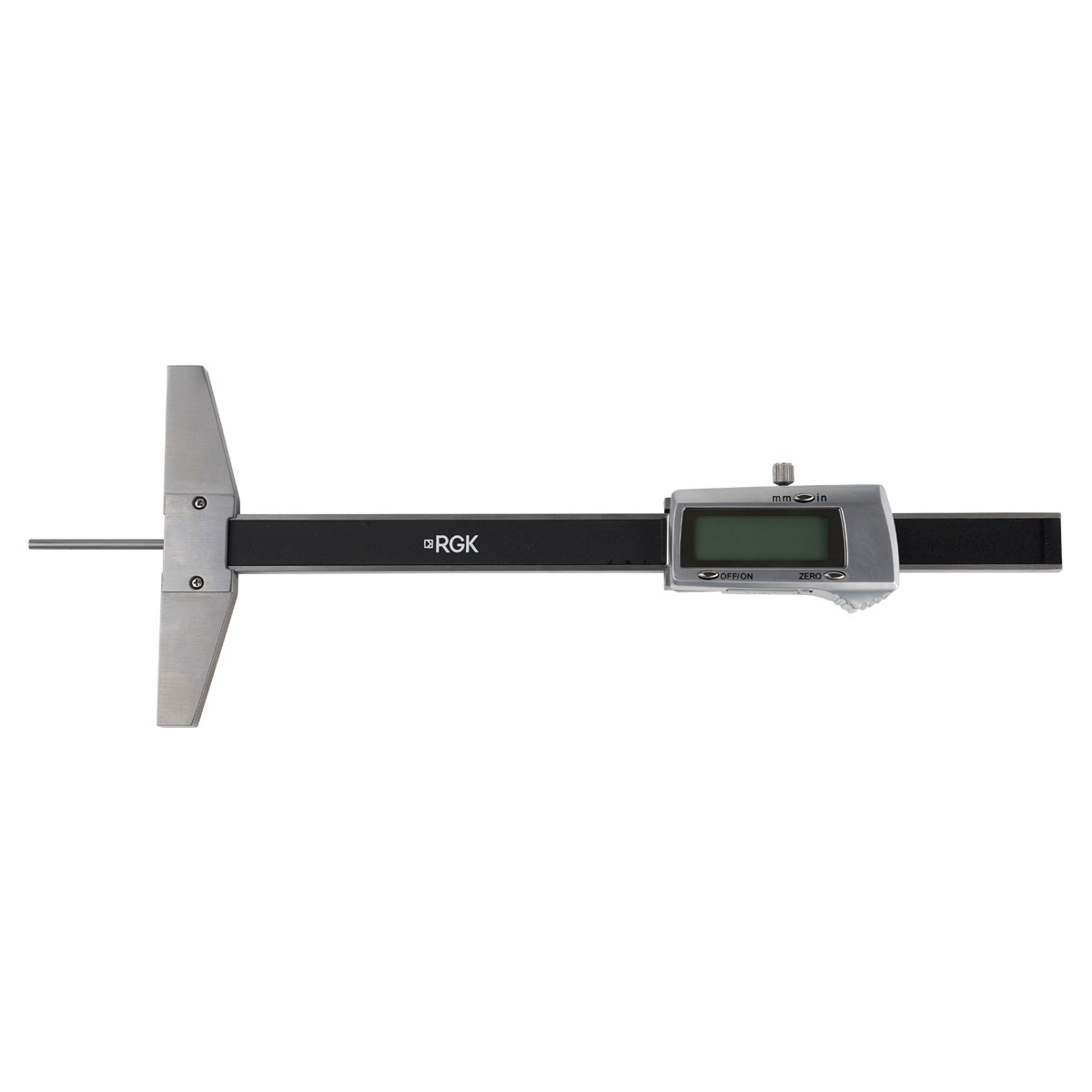 Электронный штангенглубиномер RGK SCG-150 специально разработан для измерения глубины глухих отверстий небольшого диаметра. В отличие от "классической" конструкции ШГЦ по ГОСТ 162, в данной модели измерительная штанга выполнена в виде тонкого стального стержня с плоской опорной поверхностью. В инструменте используется только цифровая система отсчета, без традиционной миллиметровой линейной шкалы.