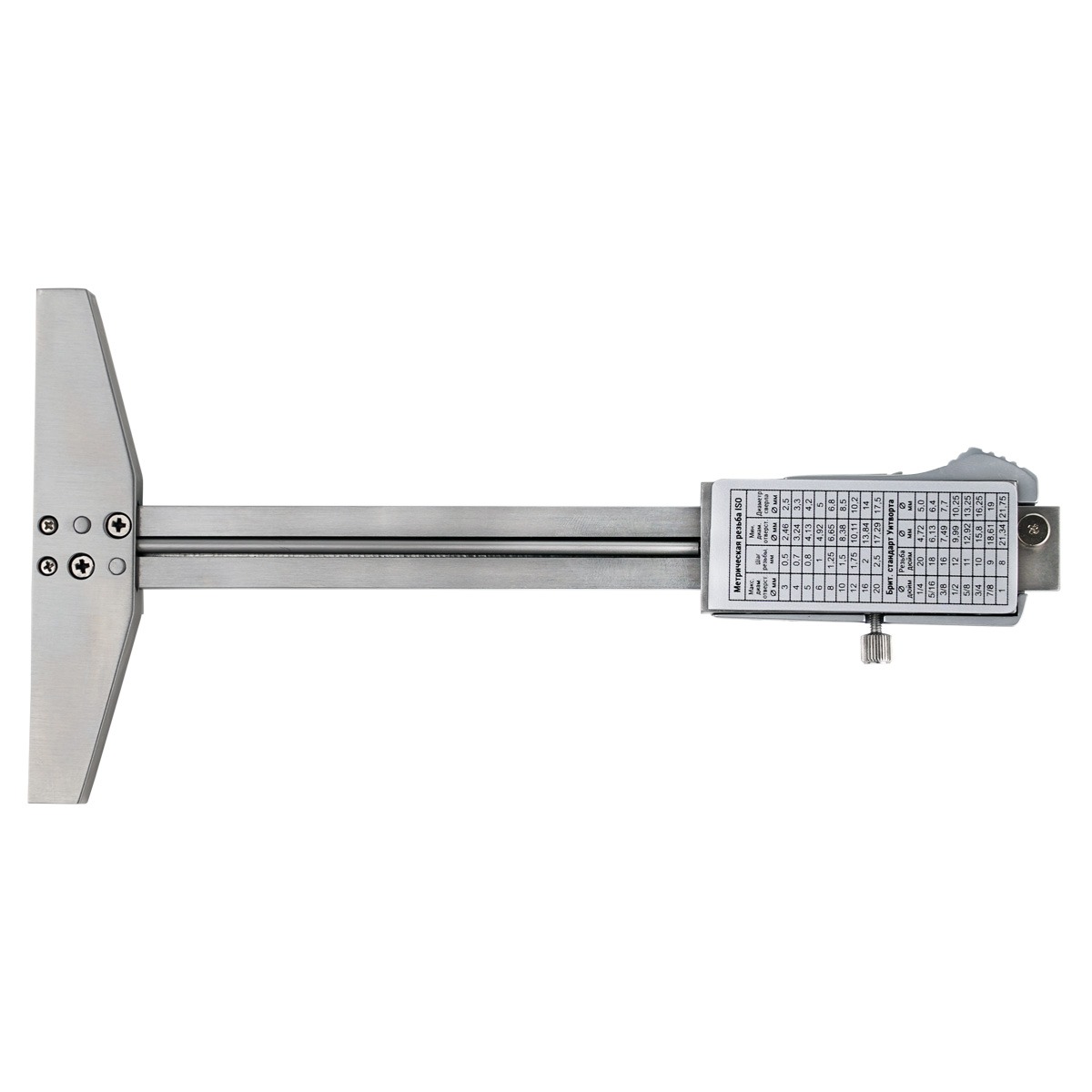 Измерительный блок электронного штангенглубиномера RGK SCG-100 скреплен с измерительным штоком и перемещается в процессе работы относительно рамки с основанием. Выступ-упор на его корпусе упрощает выполнение замеров, позволяя выдвигать штангу движением пальца, удерживающего прибор. Инструмент снабжен справочной таблицей с тыльной стороны устройства, по которой можно быстро выбрать подходящий диаметр сверла, исходя из типоразмера внутренней резьбы в стандартах Уитворта и ISO.