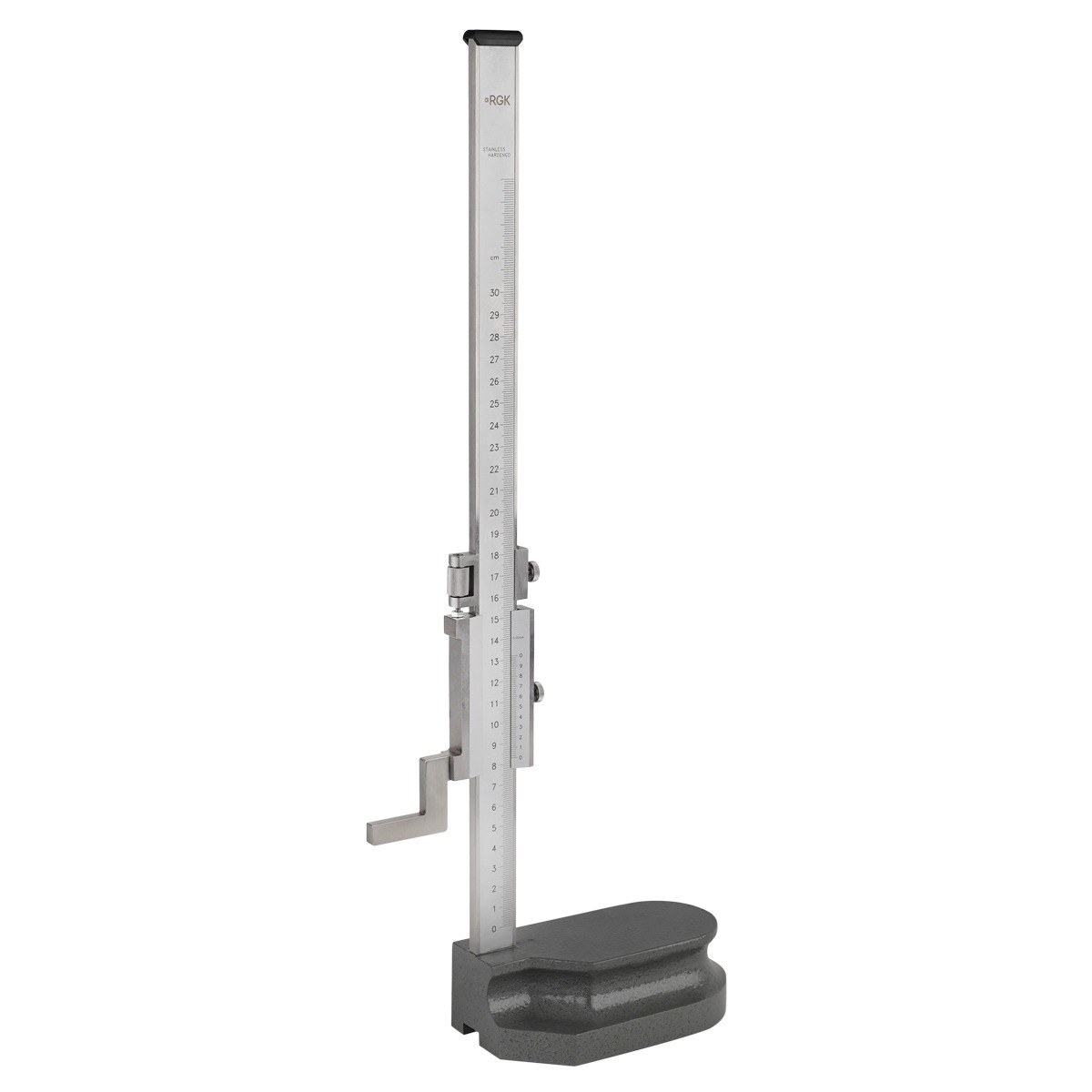 Рабочие элементы штангенрейсмаса изготовлены из стали (Stainless Hardened), характеризующейся с высокой износостойкостью, чем обеспечивается длительный срок службы измерителя даже при интенсивной эксплуатации. С целью упрощения снятия показаний миллиметровая шкала и нониус снабжены вертикально размещенными цифровыми обозначениями. На основании предусмотрены выемки под пальцы – для удобного удержания инструмента при перемещении по измерительной плите.