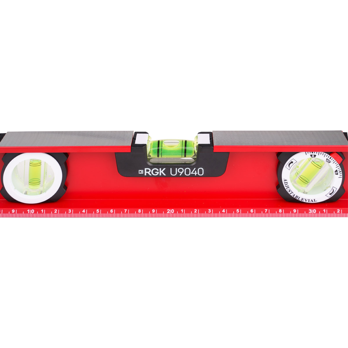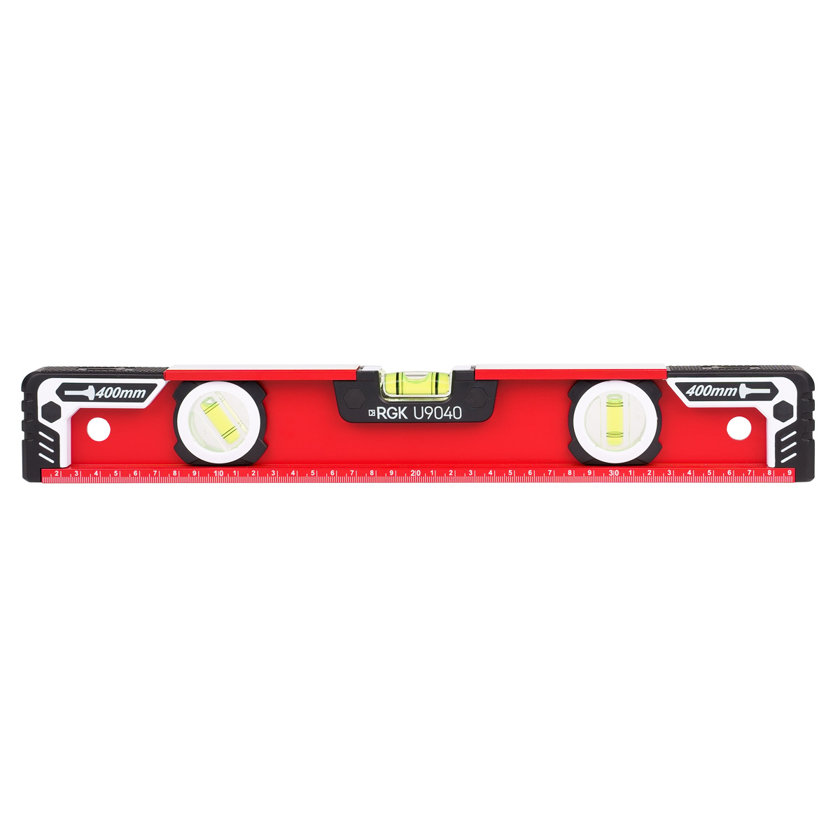 Пузырьковый строительный уровень RGK U9040 обеспечивает точность 1 мм/м. Длина 40 см позволяет использовать инструмент для проведения масштабных строительных работ по выравниванию полов, штукатурке стен и др.
