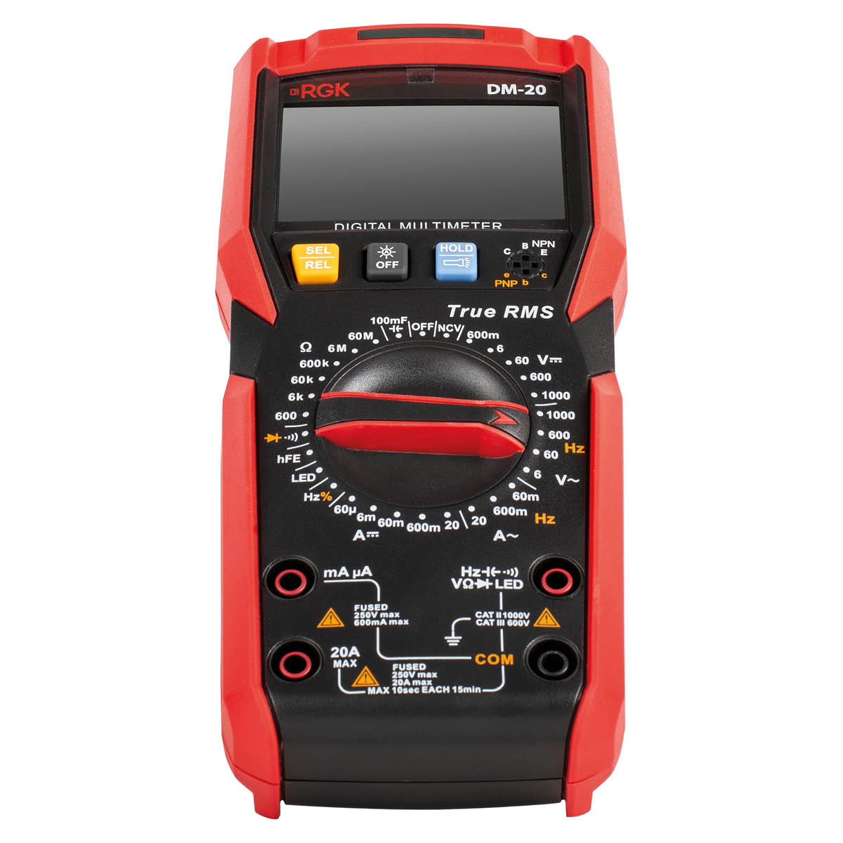 При работе в темноте профессиональный мультиметр RGK DM-20 с поверкой самостоятельно, с помощью специального сенсора определит недостаточный уровень освещения и включит подсветку дисплея. Для повышения безопасности и комфорта измерений рабочую область можно дополнительно подсветить встроенным светодиодным фонарем. Полученные значения фиксируются на экране кнопкой HOLD, что позволяет удобно произвести запись в журнал. С помощью откидной поставки можно надежно установить прибор на горизонтальную поверхность и освободить руки для удобных манипуляций с щупами и другим оборудованием.