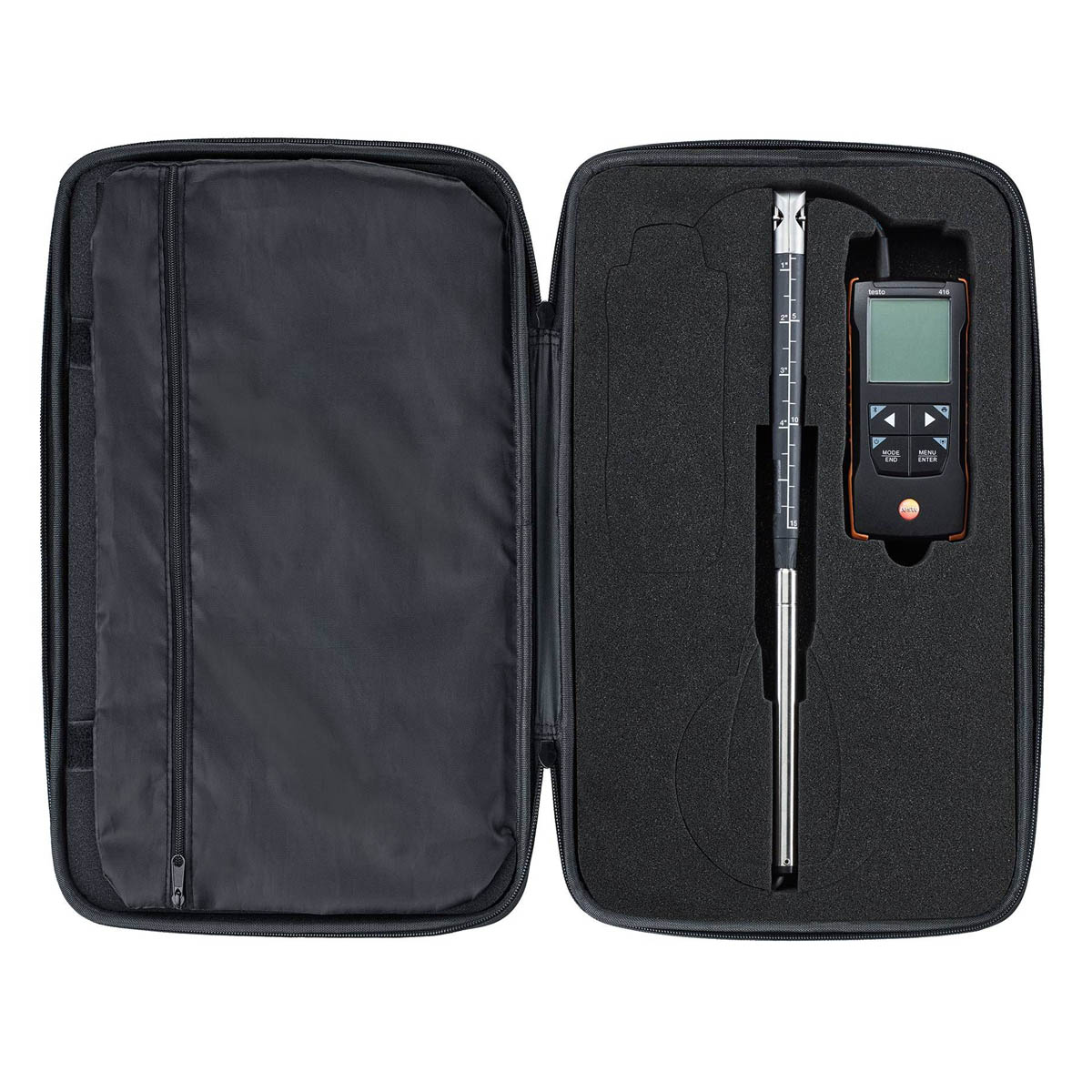 Анемометр Testo 416 – компактный цифровой прибор, снабженный выносным зондом на телескопической рукоятке длиной 850 мм, обеспечивающим выполнение измерений в воздуховодах. В качестве сенсора используется датчик роторного типа диаметром 16 мм, позволяющий контролировать скорость воздушных потоков большей величины, по сравнению с моделью testo 425 – до 40 м/с, с автоматическим расчетом объемного расхода воздуха. От устройства предыдущего поколения с таким же индексом анемометр отличается полностью переработанной конструкцией и поддержкой режима дистанционной передачи данных по Bluetooth на смартфон или беспроводный принтер.