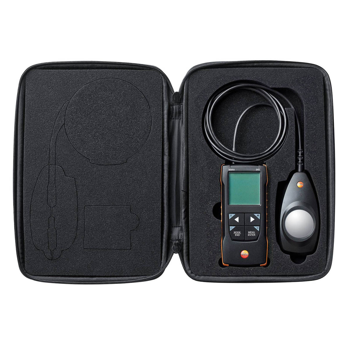Использование неотключаемого датчика на гибком кабеле длиной 1,4 м дает возможность выполнять измерения, размещая фотометрическую головку в нужном положении, и комфортно считывать получаемые результаты. Фотоприемный элемент снабжен фильтрами, за счет чего люксметр Testo 545 способен контролировать освещенность от всех наиболее распространенных источников света, включая разнотипные светодиодные излучатели. Для комфортности снятия показаний текущие результаты могут быть зафиксированы на дисплее. В ходе измерений прибор автоматически запоминает наибольшее и наименьшее зарегистрированное значение, также предусмотрена возможность усреднения получаемых результатов по заданному количеству точек либо за промежуток времени.