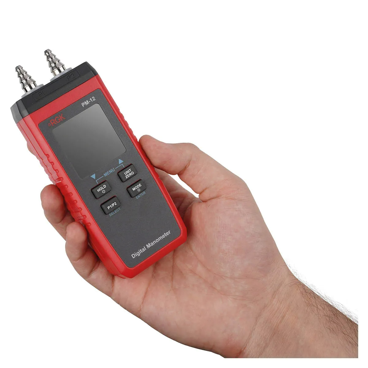 Цифровой манометр RGK PM-12 - двухканальный прибор для измерения манометрического и дифференциального давления, который часто используется при настройке и пусконаладке систем вентиляции, отопления и любых других, где есть движение воздушных масс.