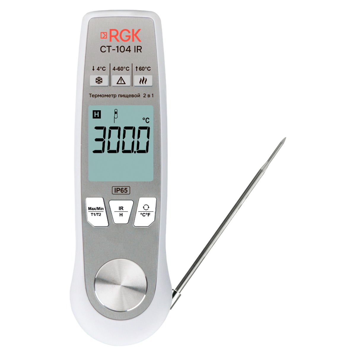 Пищевой термометр RGK CT-104 IR с поверкой является комбинированным портативным прибором типа "2 в 1", реализуя технологии дистанционных и контактных измерений температурных показателей целевых объектов. Инструмент сертифицирован в соответствии с международными стандартами для оборудования, контактирующего с продуктами питания, и включен в Госреестр РФ, как средство измерений установленного типа. Он может использоваться для оперативного контроля соблюдения технологии приготовления пищи, для инспекционных нужд при проверке соответствия температурных режимов установленным нормам в ходе хранения сырья, полуфабрикатов и готовых блюд, а также для решения других ответственных задач.