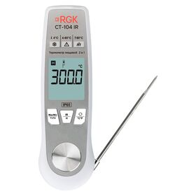 Верхний предел измерительного диапазона инструмента составляет +300°С. При этом пищевой термометр RGK CT-104 IR с поверкой способен определять температурные параметры от –30°С в бесконтактном режиме и от –40°С – с помощью зонда. Благодаря этому инструмент является подходящим решением для оценки температурных параметров охлажденных и замороженных полуфабрикатов и продуктов в процессе хранения, а также при приготовлении блюд с тепловой обработкой.