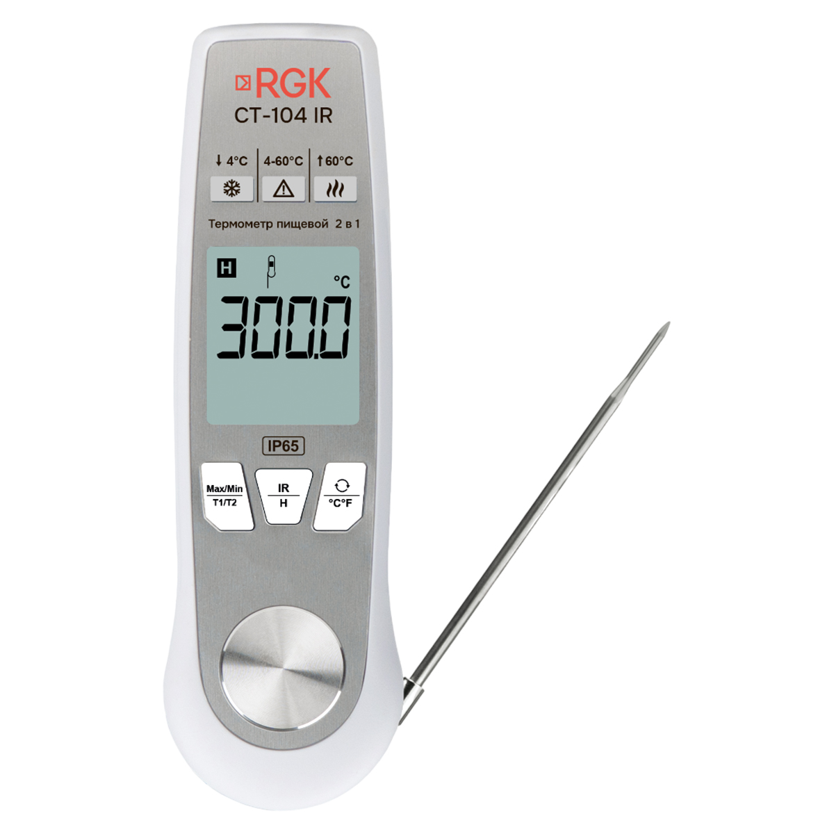 Пищевой термометр RGK CT-104 IR является комбинированным портативным прибором типа "2 в 1", реализуя технологии дистанционных и контактных измерений температурных показателей целевых объектов. Инструмент сертифицирован в соответствии с международными стандартами для оборудования, контактирующего с продуктами питания, и включен в Госреестр РФ, как средство измерений установленного типа. Он может использоваться для оперативного контроля соблюдения технологии приготовления пищи, для инспекционных нужд при проверке соответствия температурных режимов установленным нормам в ходе хранения сырья, полуфабрикатов и готовых блюд, а также для решения других ответственных задач.