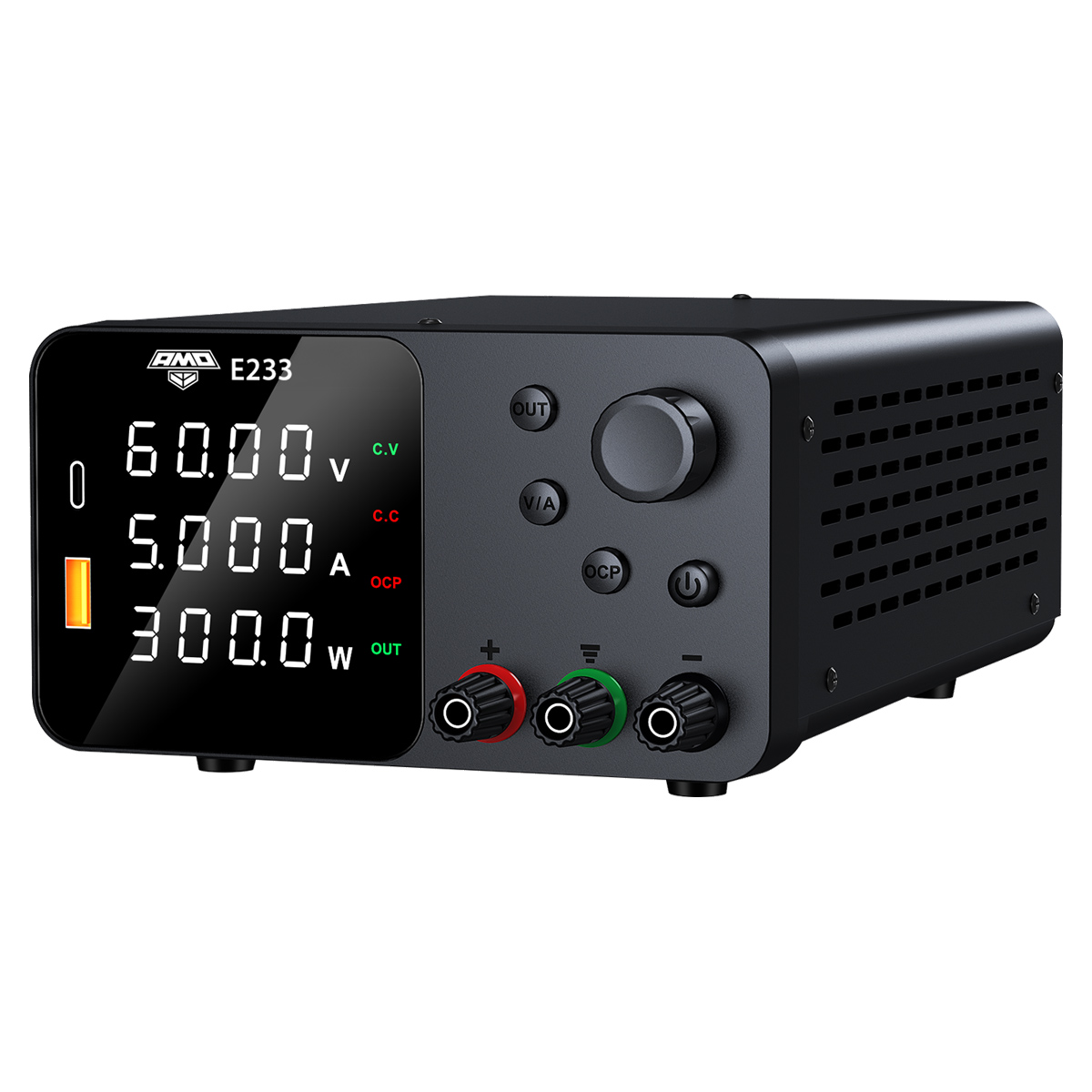 Несмотря на "промышленный" уклон, AMO E233 не забывает о комфорте пользователя. На передней панели расположены USB-A и USB-C порты с общей мощностью до 18 Вт — вы можете заряжать смартфон, мультиметр или планшет, не отвлекаясь от основной задачи. Это превращает источник питания в полноценную инженерную рабочую станцию.