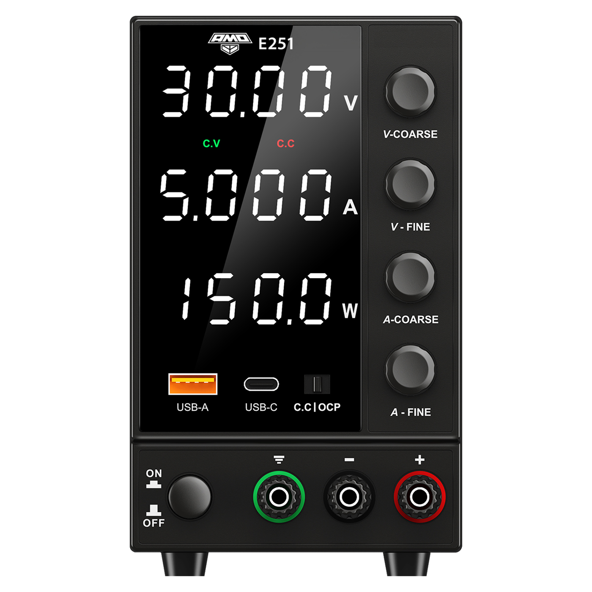 Помимо основного регулируемого выхода, AMO E251 оснащен двумя USB-портами — USB-A и USB-C — с общей мощностью до 18 Вт. Это позволяет одновременно заряжать смартфон или измерительный инструмент — все без лишних адаптеров и розеток. Такой подход превращает источник питания в полноценную инженерную рабочую станцию.