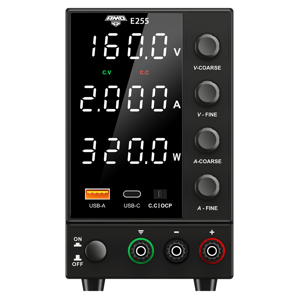 AMO E255 автоматически переключается между режимом стабилизации напряжения (CV) и стабилизации тока (CC) в зависимости от поведения нагрузки. На передней панели четко отображаются индикаторы CV, CC и OCP, так что вы всегда видите, в каком состоянии находится прибор — даже не глядя на числовые значения. Это особенно ценно при работе с нелинейными нагрузками, такими как газонаполненные лампы или емкостные цепи, где ток может резко меняться.