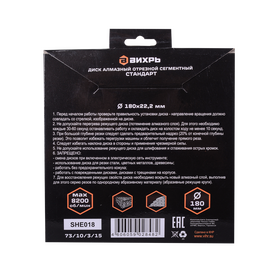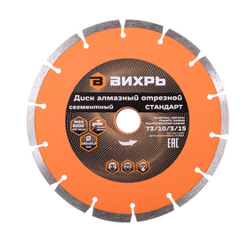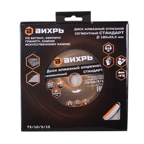 Диск алмазный отрезной сегментный СТАНДАРТ, 180 х 22,2 мм, сухая резка Вихрь