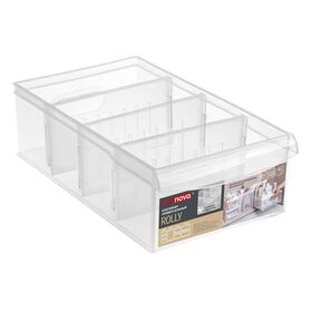 Контейнер универсальный Rolly от Econova подойдёт для хранения различных предметов (химии, кухонных предметов, одежды, игрушек). С помощью нескольких перегородок, которые идут в комплекте, и специальных пазов можно менять размер отделений контейнера по необходимости, приспособив как для мелочей, так и для крупных предметов. Прозрачные стенки позволяют видеть, что хранится внутри каждого из контейнеров.