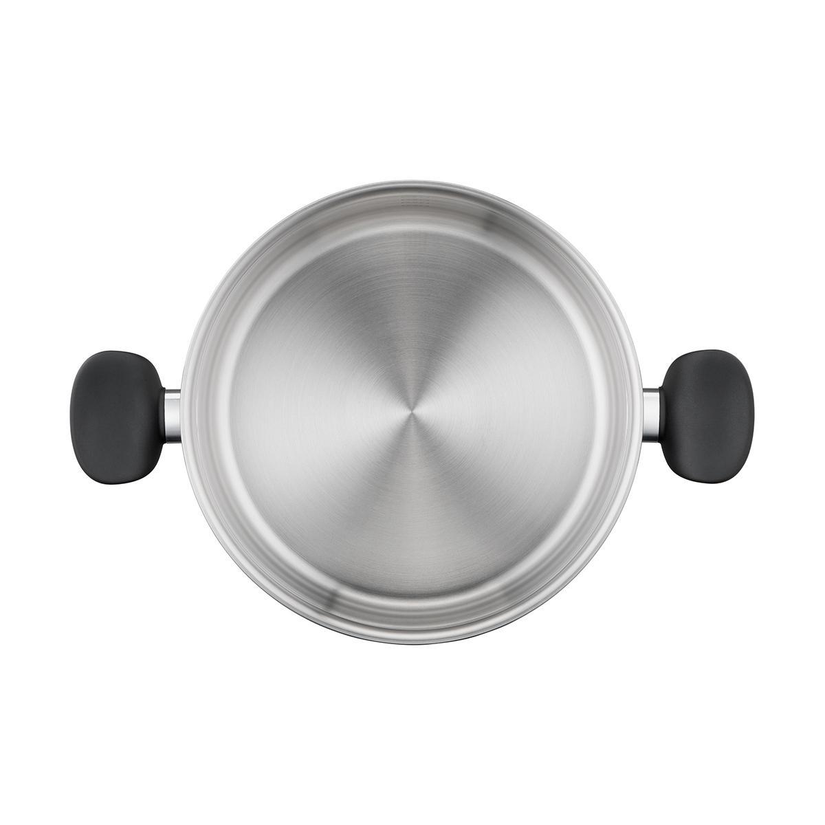 На внутренней поверхности стенки расположена удобная мерная шкала, края оснащены носиками для слива жидкости без брызг, а элегантная стеклянная крышка с паровыпуском позволяет наблюдать за процессом и сохраняет сочность каждого блюда. Кастрюля выполнена из долговечной нержавеющей стали сплава 18/10 и защищена 10-летнией гарантией качества. Эргономичные ручки не нагреваются и обеспечивают комфортное и безопасное использование день за днем.