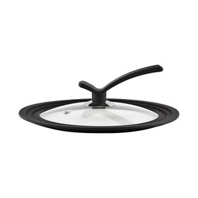 Стеклянная крышка с пароотводом и силиконовыми частями, защищающими стекло при падении, является поистине универсальной: ее можно использовать на кастрюлях и сковородах диаметром 24, 26 и 28 см. Длинная ручка из бакелита с антискользящим эффектом позволит удобно хранить крышку на столе.