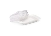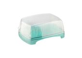 Масленка изготовлена из пищевого безопасного пластика. Зажимы по бокам масленки, надежно прикрепляют дно масленки к крышке. На дне корпуса находиться мерная шкала (в граммах), для удобного отрезания необходимого количества масла. Прозрачная крышка позволяет видеть содержимое. Подходит для мытья в посудомоечной машине.