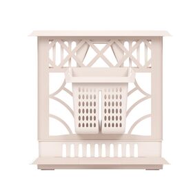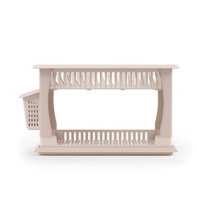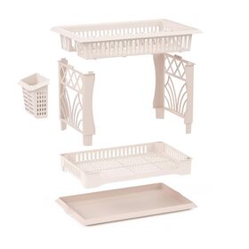 Верхний ярус позволяет размещать тарелки, а нижний ярус – чашки или другую глубокую посуду. На боковой стойке, соединяющей два яруса, располагается специальный карман для сушки столовых приборов. Поддон позволяет собрать стекающие капли и защитить поверхность стола от влаги.