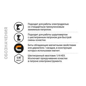 Магнитный держатель оснащён мощным неодимовым магнитом, облегчает работу и ускоряет процесс замены бит. Шестигранный хвостовик 1/4 HEX исключает проскальзывание оснастки в патроне электроинструмента. Подходит для работы электродрелью со стандартным трёхкулачковым зажимным патроном и шуруповёртом с шестигранным патроном для быстрой смены насадки.