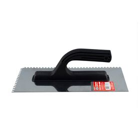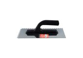 Зубчатая гладилка изготовлена из нержавеющей стали, оснащена эргономичной пластиковой ручкой.