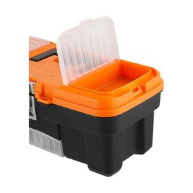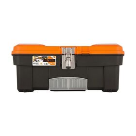 Ящик для инструментов с металлическими замками рассчитан на повышенные нагрузки. Хранение инструментов в ящике защищает их от пыли и грязи. Наличие ручки позволяет переносить инструменты на место выполнения работ. Съемный внутренний лоток позволяет отделить инструменты и аксессуары первой необходимости от основного отсека. Крышка ящика оснащена органайзерами для хранения мелочей.