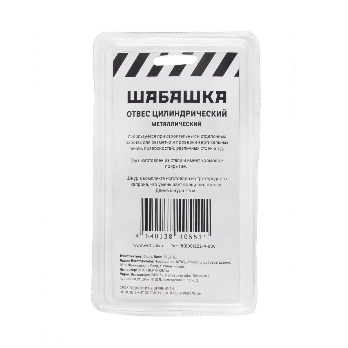 Цилиндрический отвес Шабашка - это приспособление, состоящее из тонкого шнура и небольшого грузика на его конце. Поверхность имеет защитное покрытие из хрома.
