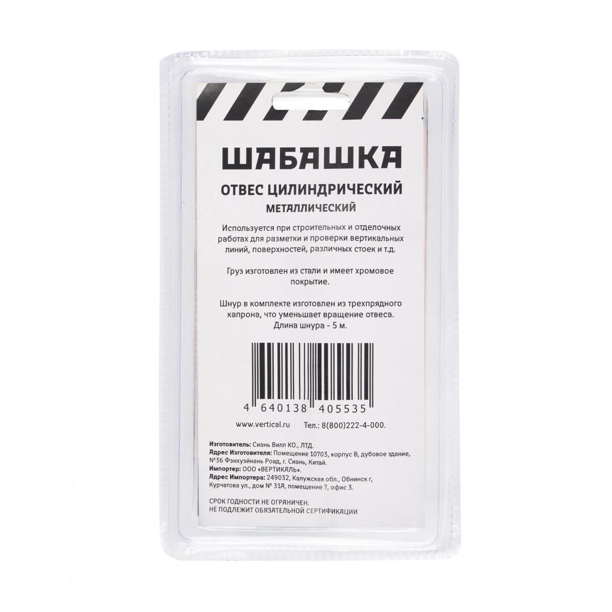 Цилиндрический отвес Шабашка - это приспособление, состоящее из тонкого шнура и небольшого грузика на его конце. Поверхность имеет защитное покрытие из хрома.