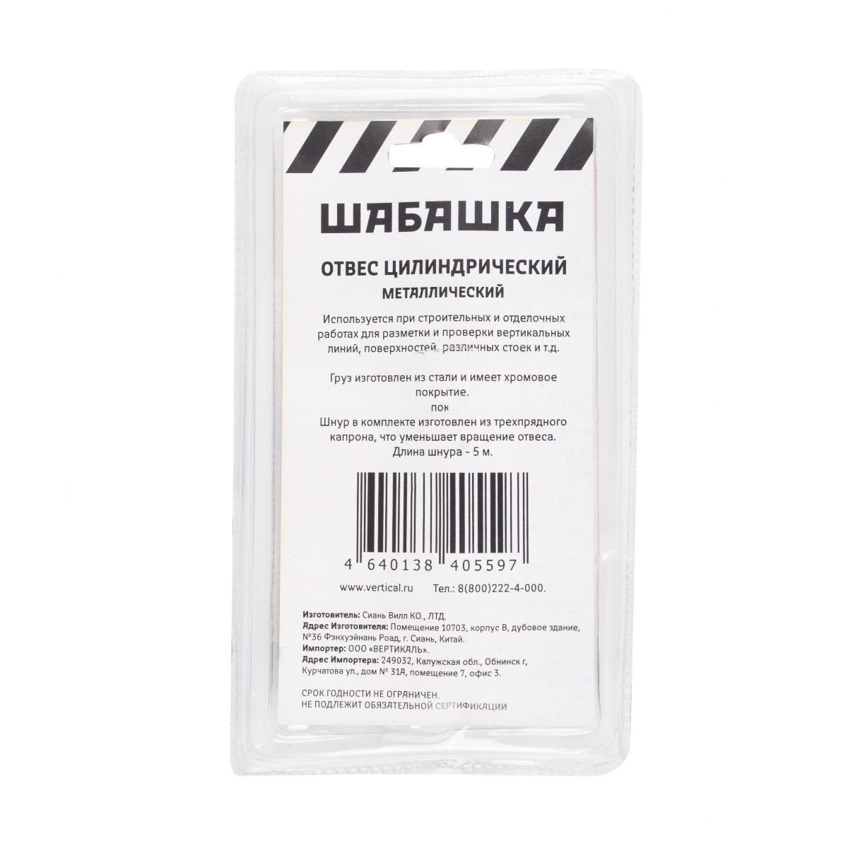 Цилиндрический отвес Шабашка - это приспособление, состоящее из тонкого шнура и небольшого грузика на его конце. Поверхность имеет защитное покрытие из хрома.