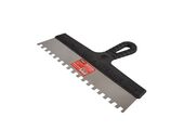 Полотно фасадного шпателя выполнено из нержавеющей стали толщиной 0,4 мм, инструмент не подвержен коррозии и прослужит долгое время. Зубцы на шпателе позволяют применять инструмент для работы с вязкими материалами и экономичней расходовать раствор. Ширина шпателя 300 мм, размер зубцов 10 x 10 мм.