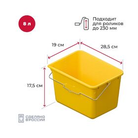 Ведро желтое 8 л подходит для профессиональных работ, с применением различных размеров валиков и кистей. Изготовлено из качественного полипропилена, устойчивого к нагрузкам и воздействию растворителей, что гарантирует долговечность изделия.