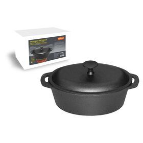 Толстостенная чугунная овальная кастрюля объемом 3,9 л с масляным термопокрытием. Используется для приготовления различных блюд