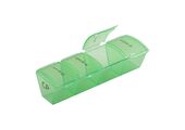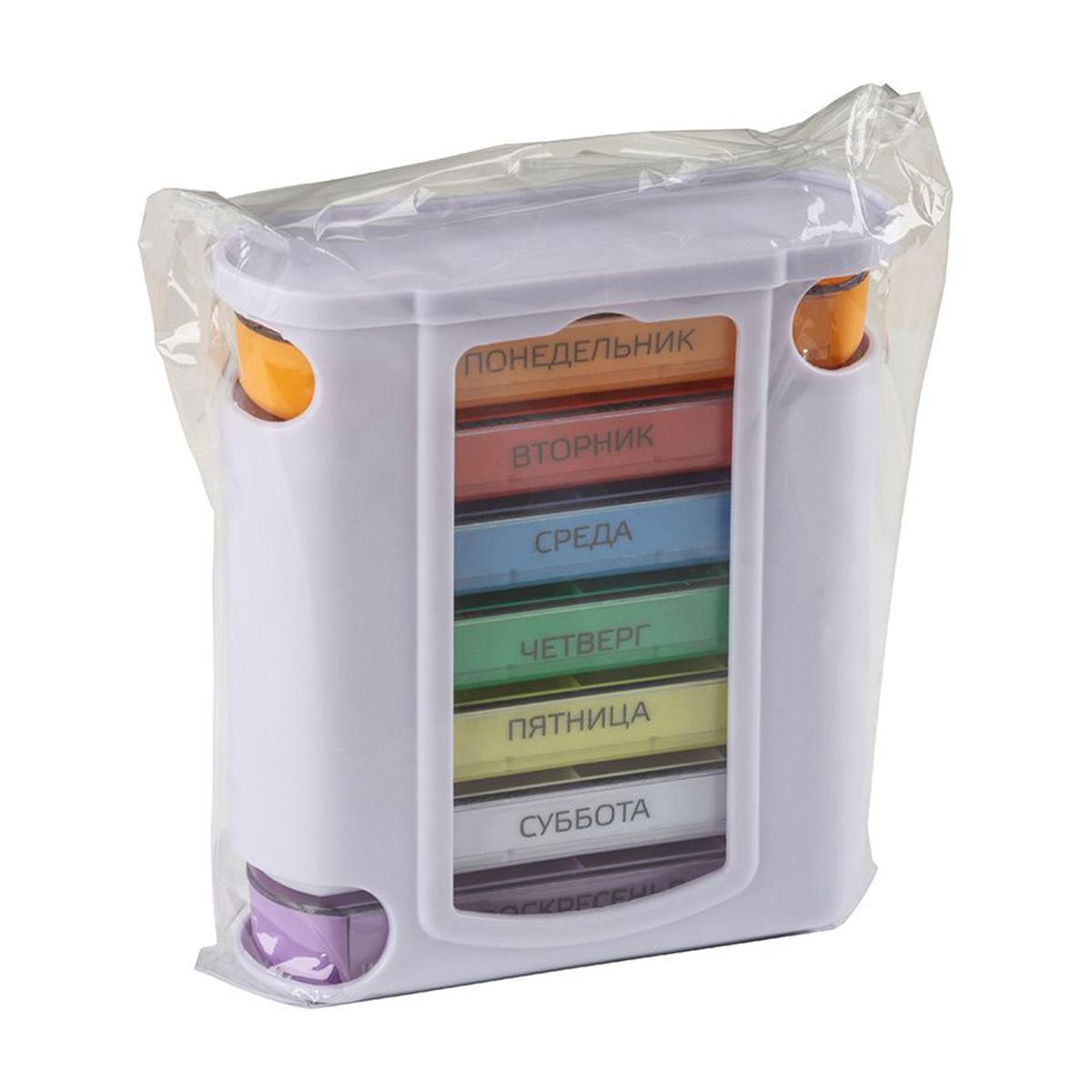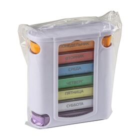Таблетница содержит 7 отдельных контейнеров, которые соответствуют дням недели. Каждый контейнер состоит из 4 отделений для распределения лекарств в соответствии с суточным режимом приема: утро, день, вечер и ночь.