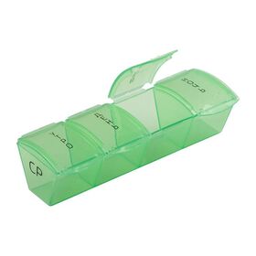 Содержит 7 отдельных контейнеров, которые соответствуют дням недели. Каждый контейнер состоит из 4 отделений для распределения лекарств в соответствии с суточным режимом приема: утро, день, вечер и ночь.