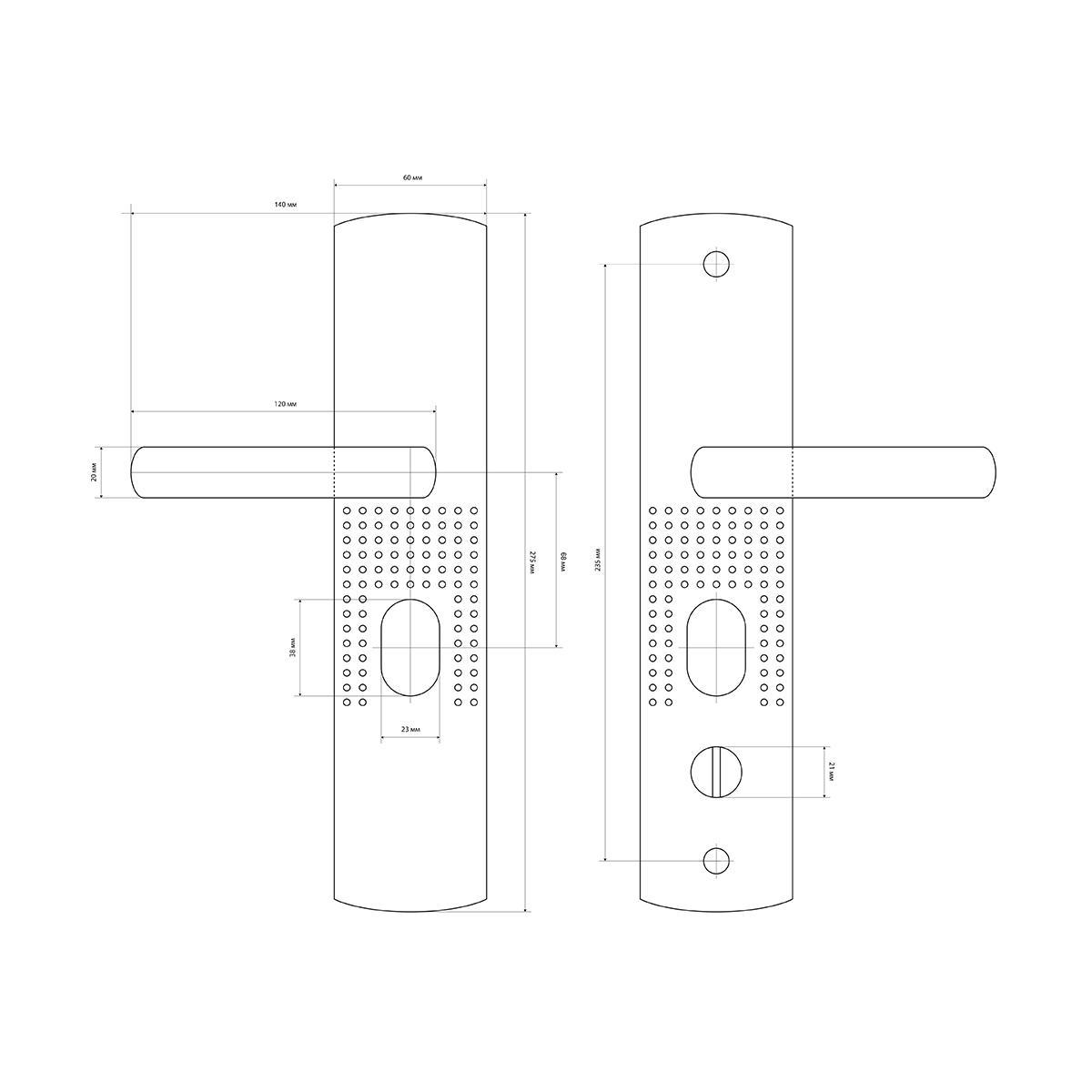 Ручка на планке под цилиндровый механизм. Материал планки выполнен из стали толщиной 1 мм с гальваническим покрытием.