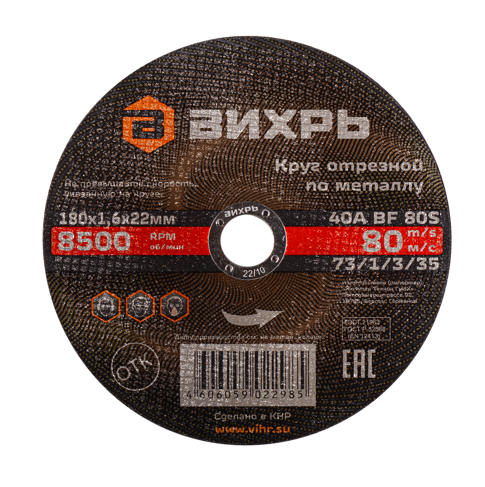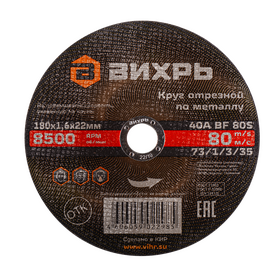 Круг отрезной по металлу ВИХРЬ 180х1,6х22 мм