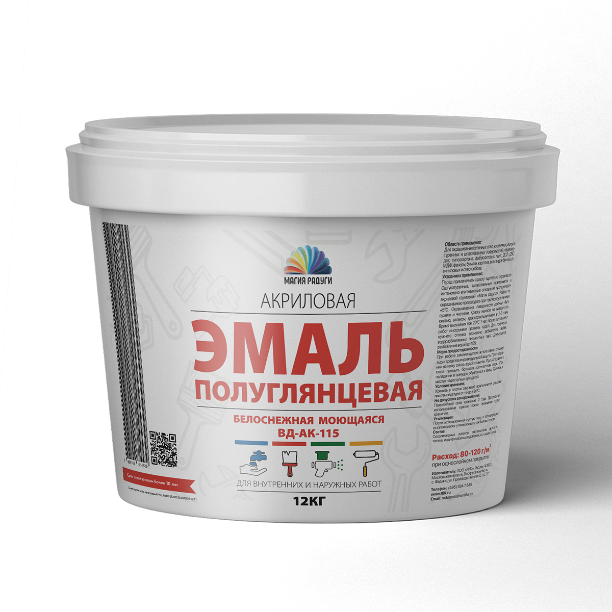 Эмаль акриловая Магия Радуги ВД-АК-115, полуглянцевая, 12 кг, белоснежная