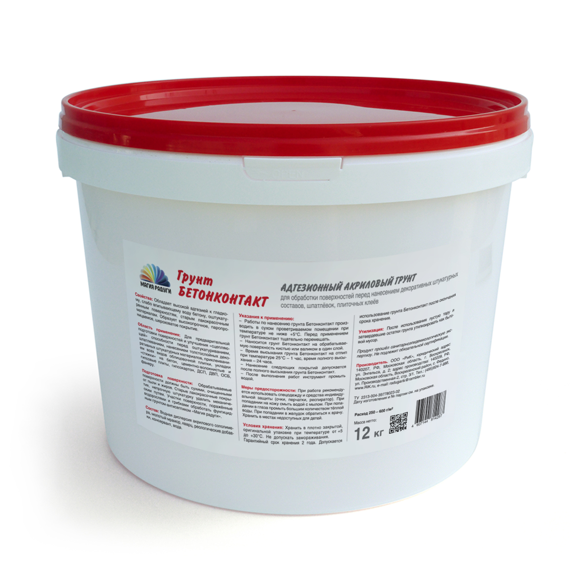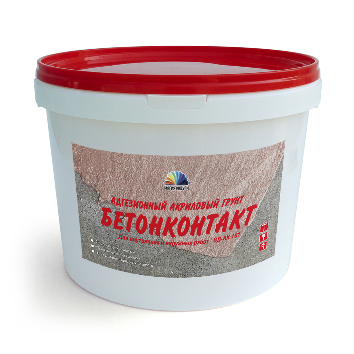 Высококачественная адгезионная грунтовка бетон-контакт на основе сополимерной акриловой дисперсии образует на поверхности равномерное шероховатое покрытие, за счет чего улучшает сцепление последующих отделочных слоев с поверхностью. Укрепляет основание и увеличивает долговечность покрытия.