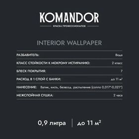 Краска для обоев Komandor Interior Wallpaper, матовая, база А, белая, 0,9 л